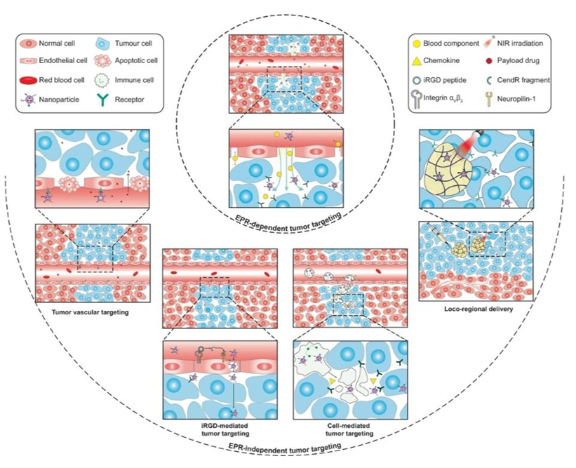 Figure 3: Schematic illustration of EPR-dependent and -independent strategies for tumor tissue-targeted nanoparticle delivery