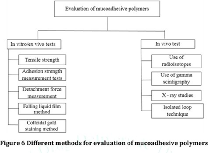 Mucoadhesive drug delivery systems can be evaluated by testing their adhesion strength. Various in vitro and in vivo tests (Figure 4) are available to determine the adhesion strength of the mucoadhesive polymers.