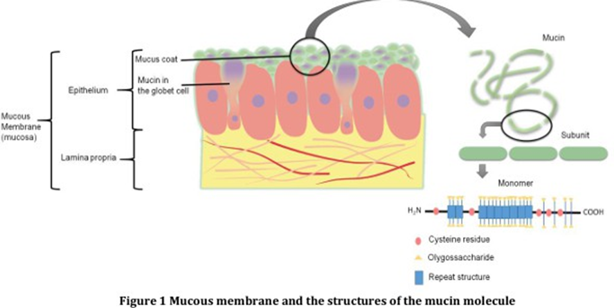 The latter entangles and adhesively crosslinks reversibly in order to make up the viscoelastic, shear- thinning gel, by physiological mechanisms. Although mucin is the main factor responsible for the mucus gel properties, the viscoelastic behavior is also governed by water content, and lipids and ions from the mucus, being crucial for protection and lubrication. Furthermore, mucin (Figure 1) behaves as an anionic polyelectrolyte at neutral pH due to sialic acid, which is believed to be responsible for the bacteriostatic action observed in mucus. Mucus exhibits many functions such as protection and lubrication of the epithelium, in order to impair the absorption of microorganisms and other substances. In addition, mucus allows the passage of objects and preservation of the hydrated mucous layer, while other supplementary functions depend on the epithelium being covered. Although mucus has demonstrated numerous functions, it is a dynamic system, being continuously removed from the epithelial layer and can reduce the residence time, as well as decrease the drug delivery rate at the site of administration.