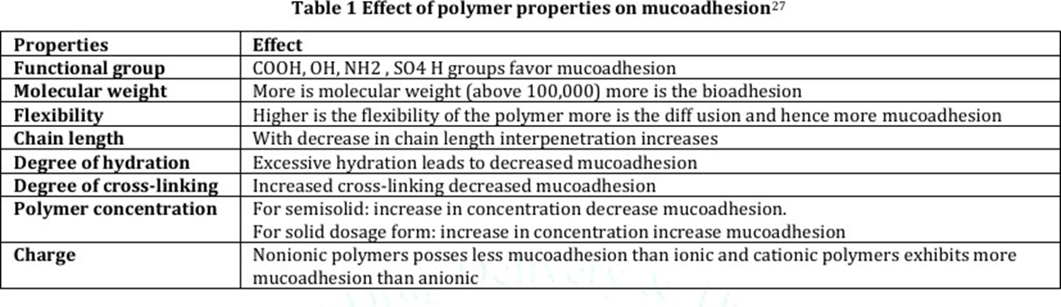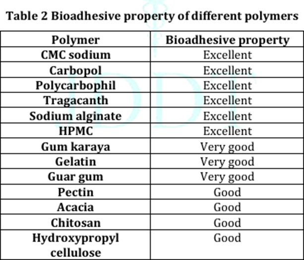 Different polymers exhibit different mucoadhesive properties depending on their physical and chemical strength. For example, a more flexible polymer exhibits higher degree of mucoadhesive property.