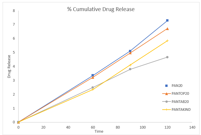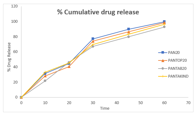 Brands A and B are 5.72 kg/cm2 and 5.66 kg/cm2, respectively, whereas the average hardness values of Brands C and D are 5.58 kg/cm2 and 5.1 kg/cm2, respectively (table 7). This shows that both brands are acceptable in the hardness test as all four Hardness values are less than the pharmacopeia limit. The pharmacopeia mentions that a 0.5 1% tablet loss during shipping is acceptable, and the friability equipment utilized in this friability test shows that the friability test was successful for all four tablet brands. The disintegration test of pantoprazole tablets was conducted in 0.1N HCl and phosphate buffer pH 6.8. In 0.1N HCl, no tablets disintegrated, which shows successful enteric coating intended to withstand acidic environments. In phosphate buffer (pH 6.8), the tablets disintegrated at different times: Brand A (16.32 min), Brand B (19.43 min), Brand D (20.32 min), and Brand C (25.15 min). The fastest disintegration was shown by Brand A, and the slowest was shown by Brand C, indicating differences in coating thickness or efficiency in the formulation. These differences might affect the release and efficacy of the drug. The dissolution profiles of four pantoprazole tablet brands (A, B, C, and D) were compared. The experiment was carried out using USP Type II apparatus in 0.1N HCl (pH 1.2) at 37 ± 0.5°C with the drug release determined by UV spectrophotometry. The results indicated that Brand A released the most drug (99.72%), followed by Brand B (98.41%), Brand D (96.23%), and Brand C (92.74%). Although all brands satisfied pharmacopeial standards, variations in dissolution rates can influence therapeutic effectiveness.