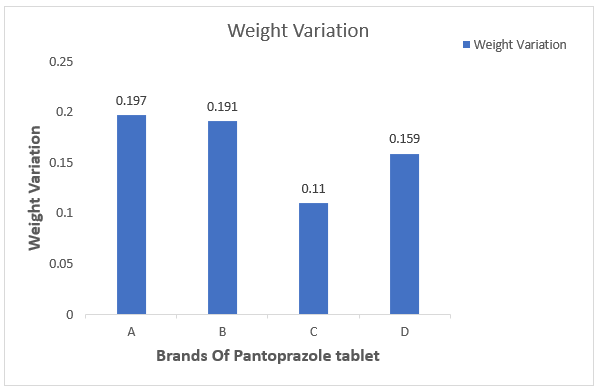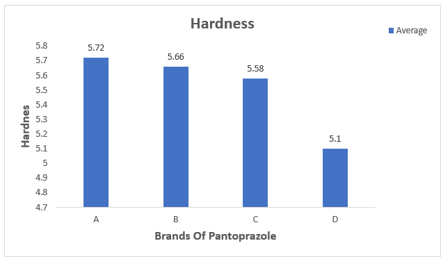 All four brands' pantoprazole tablets were according to IP standards found to be within ±7.5% of the average weight of the tablets. All four brands performed within the specified ranges. The results show that brand A has more weight variation than brand B, and brand D has more weight variation than brand C (Fig 2). This could be attributed to the lower powder flowability under compression. The range of hardness is from 4 to 10 kg/cm2. Based on hardness tests, the average hardness values for