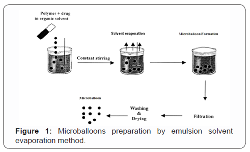 This emulsion is then added to a large volume of aqueous phase containing an emulsifying agent (such as polyvinyl alcohol), resulting in the formation of a multiple emulsion system. Continuous stirring facilitates the evaporation of the organic solvent, leading to precipitation of the polymer around the aqueous droplets. As the solvent evaporates, hollow microspheres (microballoons) are formed due to the removal of solvent from the internal phase. The formed microballoons are collected, washed to remove residual solvent and surfactant, and finally dried.