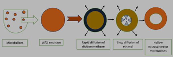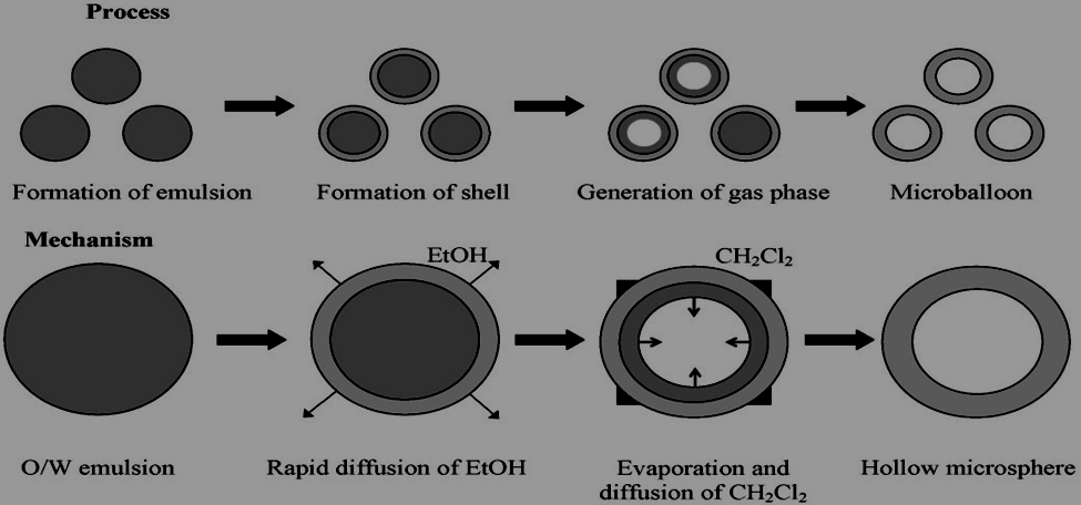 Ethanol rapidly diffuses into the external aqueous phase, leading to a reduction in polymer solubility and causing polymer precipitation around the methylene chloride droplets. Subsequently, the entrapped methylene chloride slowly evaporates, resulting in the formation of internal cavities within the microspheres. These cavities are responsible for the hollow structure and buoyancy of microballoons.