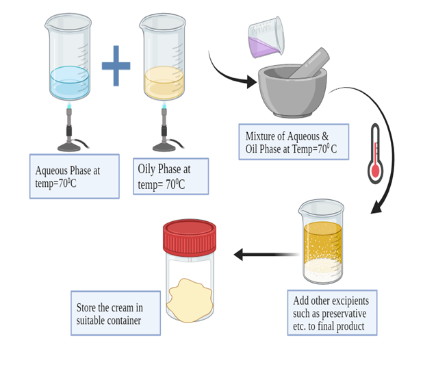 Creams are semisolid dosage forms that consist of one or more active ingredients dispersed in a suitable base. There are different methods for preparing creams, depending on the type and composition of the base and the active ingredients. [31] Some of the common methods as shown in following steps: