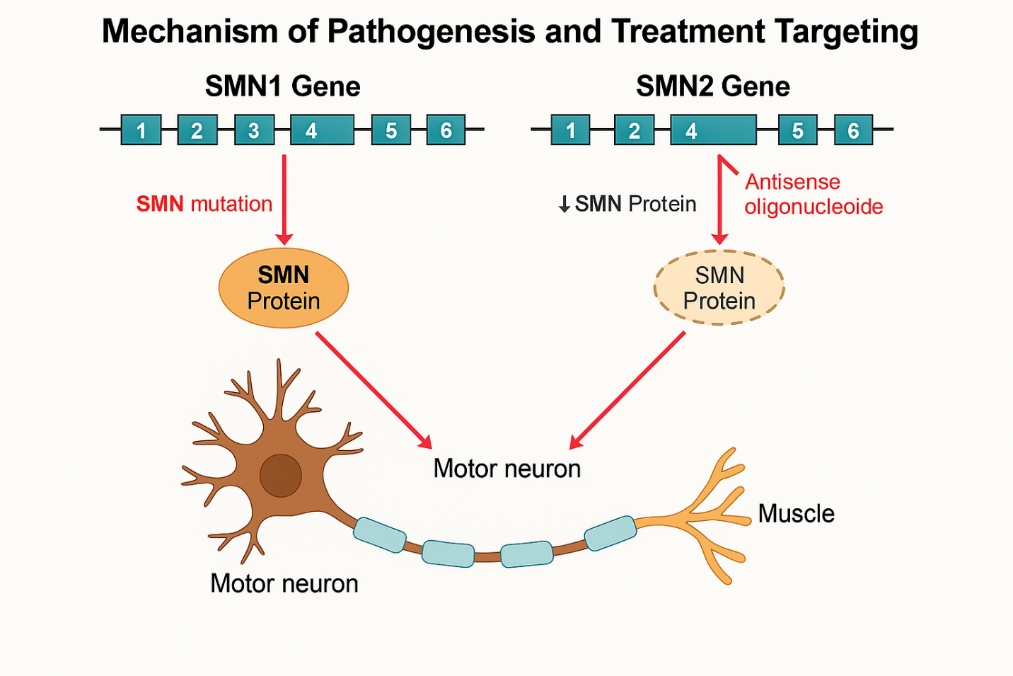 Spinal muscular atrophy (SMA) is a hereditary neuromuscular disorder driven by the loss of alpha motor neurons in the spinal cord’s anterior horn, leading to progressive muscle weakness, atrophy, and, in severe cases, respiratory failure. The root cause is mutations or deletions in the SMN1 gene on chromosome 5q13, which encodes the survival motor neuron (SMN) protein essential for RNA metabolism and motor neuron integrity [18]. SMA’s autosomal recessive nature requires two defective SMN1 alleles for disease manifestation, with carriers typically asymptomatic due to sufficient SMN production from one functional copy. SMA’s clinical presentation varies widely, categorized into five types based on age of onset and motor milestones [21]: