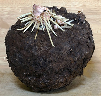 It is a dark brown, depressed-globose tuber with thick, rhizomatous off lets generated every season and noticeable5.
