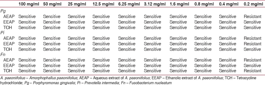 The antibacterial properties of A. paeoniifolius extracts have been tested against a variety of microorganisms, including Bacillus subtilis and Bacillus megaterium (Nayak A et al.,). The purpose of the study was to evaluate and contrast the antibacterial activity of A. paeoniifolius aqueous and ethanolic extracts against periodontal pathogens. Amorphophallus paeoniifolius tuber was collected and authenticated. The plant tuber was dried in shade and powdered. Using the Soxhlet extraction method, A. paeoniifolius aqueous and ethanolic extracts were prepared. Antibacterial activity was tested against Standard strains of Porphyromonas gingivalis (ATCC 33227), Prevotella intermedia (JCM 11150), and Fusobacterium nucleatum (ATCC 25886). To determine the minimum inhibitory concentrations of tetracycline hydrochloride and A. paeoniifolius extracts, the serial broth dilution method was used. The stock solutions is prepared by mixing 200 mg of prepared aqueous and ethanolic extracts in 1 ml of distilled water. To investigate the aqueous extract of A. paeoniifolius's minimal inhibitory concentrations (MIC), a set of 12 sterile vials were serially labeled 1 to 12. A 400 ml dilution of the stock solution, or aqueous extract, of A. paeoniifolius was added in tube number 1. In each tube (2 to 12) 200 ml of thioglycolate broth was added. A 10 ml of bacteria suspension was added to tubes (1 to 10) and tube 12. No organism was added to tube 11. The 200 ml of A. paeoniifolius extract from tube number 1 were added to tube number 2 and thoroughly mixed. Now, this mixed solution was added to tube number 3 and well mixed. This was carried on until tube number 11 and lastly 200 ml of mixture was removed from tube number 11. Tube number 11 was known as a broth control (to ascertain sterility check) because it contained broth and extract but no organism. Tube number 12 was regarded as an organism control (to check organism growth) because it contained broth and organism but no extract. A. paeoniifolius aqueous extract concentrations100, 50, 25, 12.5, 6.25, 3.1, 1.6, 0.8, 0.4, and 0.2 mg/ml, obtained. After that, the tubes were incubated at 37°C for 48 hours. A visual examination was performed to ascertain the MIC values following the incubation. The same method was carried out for ethanolic extract of A. paeoniifolius and tetracycline hydrochloride. Tetracycline hydrochloride acts as a standard control group in the present investigation. Growth of the bacteria was shown by turbidity in the MIC tube, suggesting that the bacteria were resistant to the A. paeoniifolius aqueous extract. After a 24-hour incubation period, the tubes that were determined to be MIC-sensitive were plated, and the colony count was recorded. MBC was used to determine whether the extracts and tetracycline hydrochloride had a bacteriostatic or bactericidal effect on the chosen organisms. It was thought to have bactericidal effects if there was no growth. It was determined that it was bacteriostatic if there was growth.