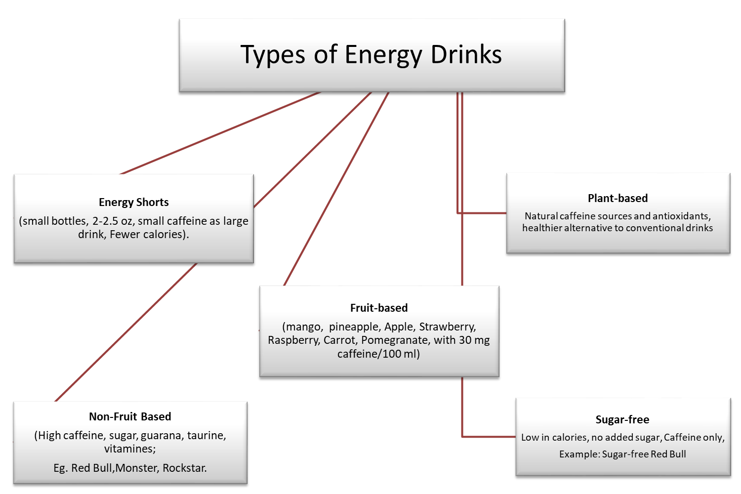 Conventional or non-fruit based EDs typically contain elevated levels of caffeine, sugar, and additional stimulatory components such as guarana, taurane, and fortified vitamins. Commonly available commercial formulations include Red Bull, Rockstar, Monster, Throttle, and NOS, with Red Bull serving as a widely recognized example of this category.