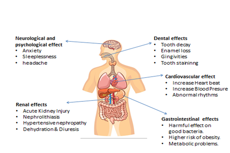 Moreover, the elevated sugar content of energy drinks has been associated with reduced activity, diversity, and gene expression of the intestinal micro biota, there by contributing to an increased risk of the obesity and metabolic syndrome. Consumption of caffeine in large amount can temporarily lower insulin sensitivity, which may explain the rise in blood glucose levels reported after drinking energy beverages in some studies.