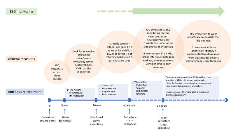 Implementing early, evidence-based treatment modalities is critical to preventing mortality and complications associated with prolonged status epilepticus (SE). Benzodiazepines remain the most effective first-line therapy, though they are often under-dosed. For second-line therapy, options include levetiracetam, fosphenytoin, or valproic acid, all of which have shown equivalent efficacy in managing established SE. In cases where patients progress to refractory and super-refractory SE, a trial of anaesthetic coma may be necessary; however, there is limited quality evidence regarding the choice of anaesthetic agents, the depth and duration of therapeutic coma, EEG treatment targets, and weaning strategies. Recent studies indicate that ketamine can be effective in aborting status epilepticus, though there is a lack of prospective comparative studies to confirm these findings. The aetiology of SE serves as a crucial predictor of patient outcomes and should guide therapeutic options. If an immunological cause is suspected, early empiric treatment with immunomodulatory drugs is advisable. In super-refractory SE cases, several additional treatment options can be considered, including repetitive transcranial magnetic stimulation (rTMS), vagal nerve stimulation (VNS), and resective surgery. Nonetheless, these treatments should be reserved for super-refractory instances, as careful consideration is warranted due to their limited evidence and potential risks of harm.
