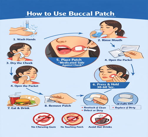 Buccal patch is a non-dissolving, thin matrix, modified-release dosage form composed of one or more polymeric films or layers containing the drug along with suitable excipients. The patch may include a mucoadhesive polymer layer that adheres to the oral mucosa, gums, or teeth, thereby ensuring controlled and prolonged release of the drug into the oral mucosa, oral cavity, or both. Buccal patches are designed to remain in position for a specified period, after which they are removed from the mouth and disposed of. A buccal patch is a small medicated adhesive system intended for placement on the buccal mucosa (inner lining of the cheek), allowing the drug to be absorbed directly through the oral mucosa into the systemic circulation, thus improving bioavailability and avoiding first-pass metabolism.