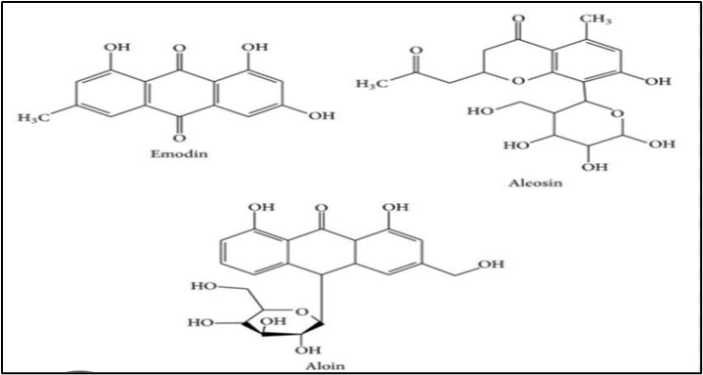 The chemical constituents in AoleVera anthraquinones, saccharides, prostaglandins and fatty acids. Others enzymes, amino acids, vitamins, minerals. Other compound Cholesterol, triglycerides, steroids, uric acid, lignins, betasitosterol, gibberellin, emodin, aleosin, aloin, salicylic acid.[48]