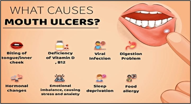 The underling source of the aliment determines how it develops specially. Xerostomia, or dry mouth brought on by a reduction in saliva production, is one of the simple mechanisms that raises the risk of oral trauma and ulcers. The mouth lining may become more vulnerable to damage if saliva production is reduced because it typically lubricants the mucous membrane and aids in bacterial control [10]. Ulceration frequently coexists with stomatitis, a condition that refers to inflammation in mouth. They are common conditions that affects most people at some point in their lives. The anatomical characteristics make the mouth cavity susceptibility to many conditions that impact the gastrointestinal system and skin. Some conditions can only manifest in the mouth, even though they often impact entire digestive system.[11] The clinical picture is further complicated by the increased risk of secondary infections in these ulcers due to the high bacterial presence in the mouth.