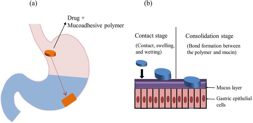 The mucoadhesive/bio-adhesive system was designed to adhere to the gastric epithelial cell surface and prolong the GRT of drug compounds. In this approach, drugs are incorporated into a mucoadhesive agent, which can be natural or synthetic polymers. The bond formed between the polymer and the mucosal surface enhances the mucoadhesion process, which typically consists of two steps.