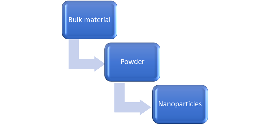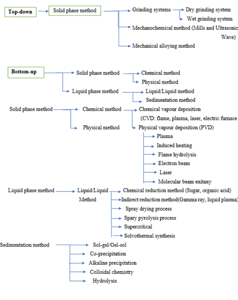 Generally, two main approaches are apply for production of nanomaterials. These approaches are Top-down approach and Bottom-up approach shown in figure-4. In Top-down approach the production of samller materials is due to application of external force to solid substance. Nanoparticles produces in bottom up method from atoms of gas or liquid which is based on atomic transformations or molecular condensations. The Top-down method consists of breakdown of solid substance. The top-down method is only of solid-phase method. Solid phase method includes griding system, Mechanochemical methods and Mechanical alloying method. Griding system consists of dry griding and wet griding system.[23]