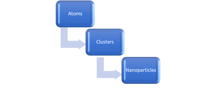 The bottom-up approach is mainly categorized into gaseous phase methods. In gaseous phase methods, reduce formation of organic impurties in particles compared to liquid phase methods because it require the use of vaccum instruments. The demrit of vaccum instruments are high in cost and low in productivity. The liquid phase methods are sub classified into liquid/liquid methods and sedimentation methods. Chemical reduction of metal ions is a example of a liquid /liquid method. [24] Microwave radiation use as a heat source which produces a quality nanoparticles at short duration of time period. Other reduction methods are photoreduction using gamma rays, ultrasonic waves and liquid plasma which can be used to preapre nanoparticles. Following requriements for device or process to produce nanoparticles:[25]