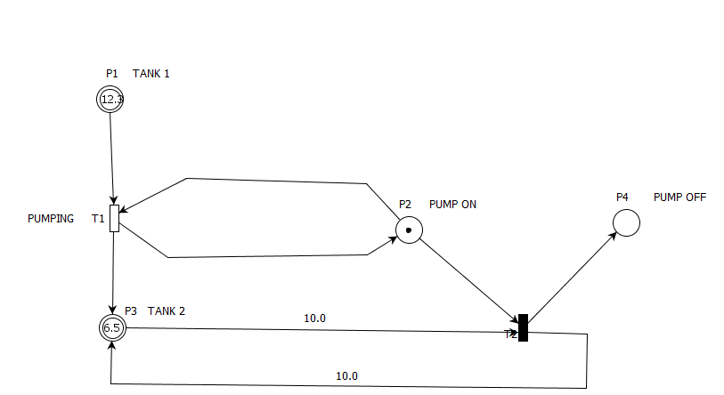 Here P1 represents the vessel 1, P2 represents vessel 2 and T1 represents the pump. Firing quantity multiplied by the weight on the arc decides the amount of liquid withdrawn from P1 or deposited to P2. Suppose P1 contain 9.3 units of liquid and firing quantity if T1 is 3.2 and the weight on the outgoing arc is 2.0 then a quantity of 6.4 will be withdrawn from P1 and deposited to P2.