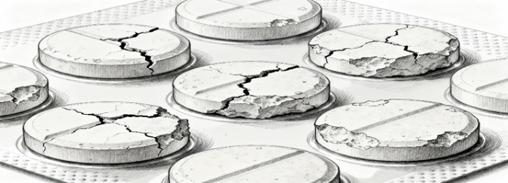 Definition: Cracking manifests as fine fissures or cracks on the upper and lower central surfaces of tablets, or occasionally on the sidewalls