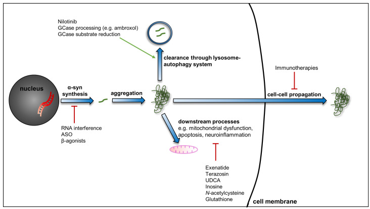 An expanding number of drugs are being considered for their ability to influence the pathogenic processes of PD. These include novel agents and technologies, such as active and passive immunisation and RNA interference techniques to limit the propagation, and synthesis, of α-synuclein. Additionally, several drugs used for other conditions are of interest for potential use in PD given their ability to influence pathways such as the lysosome–autophagy system, mitochondrial function, and neuroinflammation, for example. Abbreviations: α-syn, α-synuclein; ASO, anti-sense oligonucleotide; GCase, glucocerebrosidase; PD, Parkinson’s disease; RNA, ribonucleic acid; UDCA, ursodeoxycholic acid.