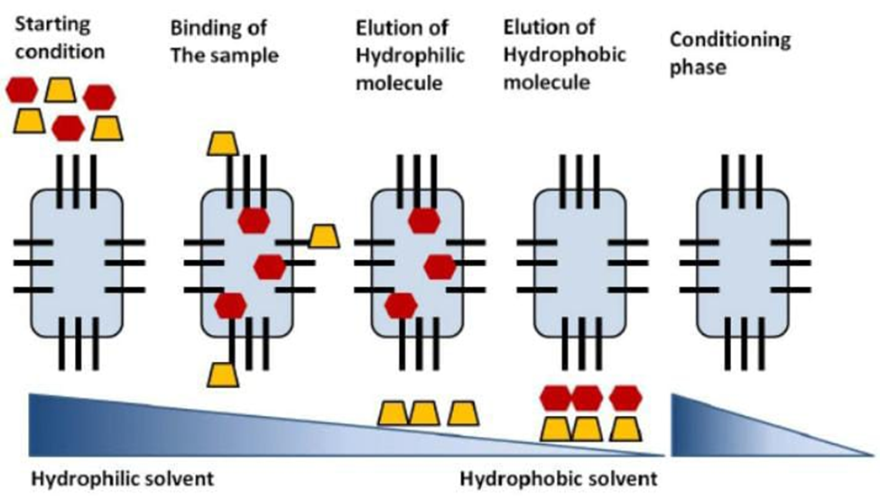 The macromolecules that are the most polar are eluted last. The more (hydrophilic) a solute is, the quicker it elutes and vice versa. In this summary, separations of chromatography reverse phase depend on the reversible adsorption/desorption of solute molecules with a variety of hydrophobicities toward a stationary hydrophobic phase. As illustrated in Figure 12, the initial step Equilibration is a necessary step in reversed phase separation column under suitable conditions such as a (pH, ionic strength and polarity). The solvent's polar orientation can be modified by adding a solvent such as acetonitrile or methanol and an ion-pairing agent such as trifluoroacetic acid or formic acid may be added. The sample is then applied and bonded to the matrix that is immobile. Following this procedure, desorption and elution of the biomolecules is achieved by lowering the mobile's polarity phase (by boosting the proportion of organic change during the mobile phase). At the conclusion of the separation, the mobile phase should be nearly 100% natural to guarantee complete elimination of all bound substances. After everything has disappeared from the column, where the initial mobile phase is used again to the column to re-equilibrate the column for a subsequent sample application.