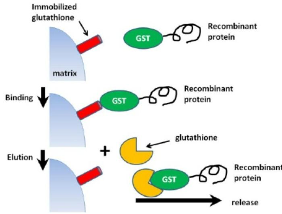 Because of the GST tag, it is possible to separate and purify proteins that are GST-tagged. is able to bind glutathione, its substrate, (Glu-Cys-Gly tripeptide). Whenever glutathione reduced (GSH), it can be immobilized onto a solid support through its sulfhydryl group. Using this property, glutathione can be cross linked to an agarose bed, which then captures GST or GST tagged protien via their substrate binding interaction. Binding is most efficient near neutral physiological conditions (pH 7.5) using Tris saline buffer and mild conditions to preserve the structure and enzymatic function of GST. because of the possibility of permanent denaturation, denaturing elution conditions are not compatible with GST purification. Additionally, during denaturation or reduction, the GST fusion tag's structure frequently degrades. Following a step of washing to get rid of unbound samples, the bound GST-fusion protein can be recovered by the addition of excess reduced glutathione since, The affinity of GST for free glutathinone exceed its affinity for glutathione in the immobilised form. The free glutathione replaces the glutathione that is stuck and makes it available the GST-tagged protein from the matrix allowing its elution from the column.