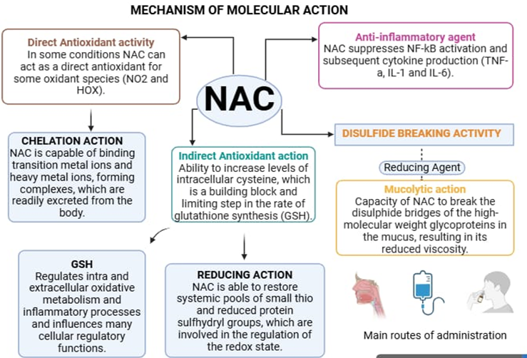 The therapeutic effects of NAC are closely tied to its biochemical mechanisms of action