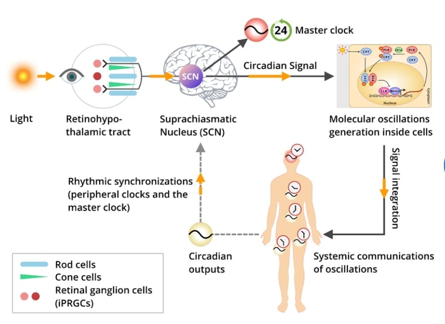 The circadian rhythm is an endogenous, approximately 24-hour cycle that governs a wide array of physiological processes, including sleep–wake cycles, hormone secretion, metabolism, immune function, and cellular repair.[4,5] This rhythm is orchestrated by the suprachiasmatic nucleus (SCN) in the hypothalamus, which synchronizes peripheral clocks in tissues such as the liver, pancreas, and heart through neural and hormonal signals.[6] At the molecular level, circadian rhythms are maintained by transcriptional–translational feedback loops involving core clock genes such as CLOCK, BMAL1, PER, and CRY.[7] These genes regulate downstream pathways that influence drug targets, metabolic enzymes, and inflammatory mediators—making circadian biology a critical determinant of pharmacological response.