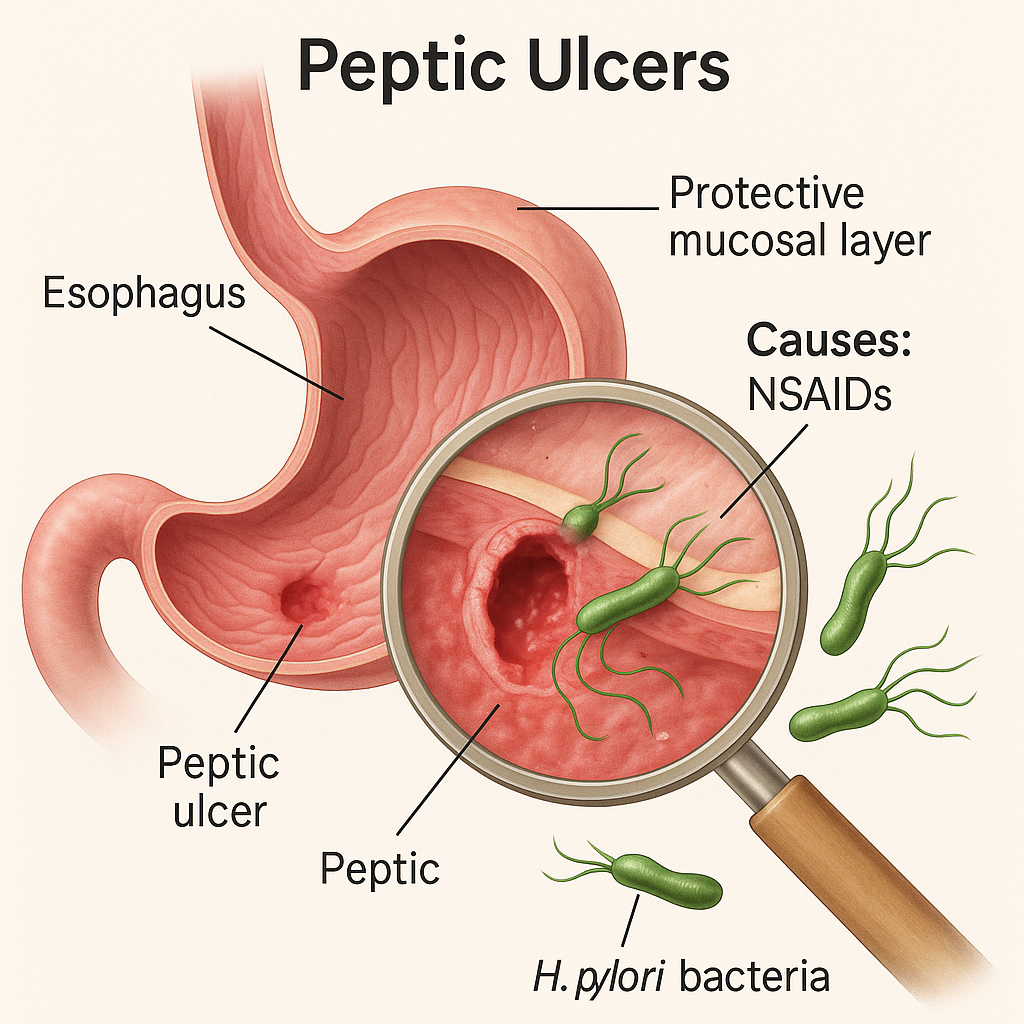 A peptic ulcer is an open wound or sore that forms in the lining of the stomach or the upper section of the small intestine. It develops when the digestive acids break through the protective lining, often due to factors like infection with Helicobacter pylori bacteria or prolonged use of nonsteroidal anti-inflammatory drug.[1]