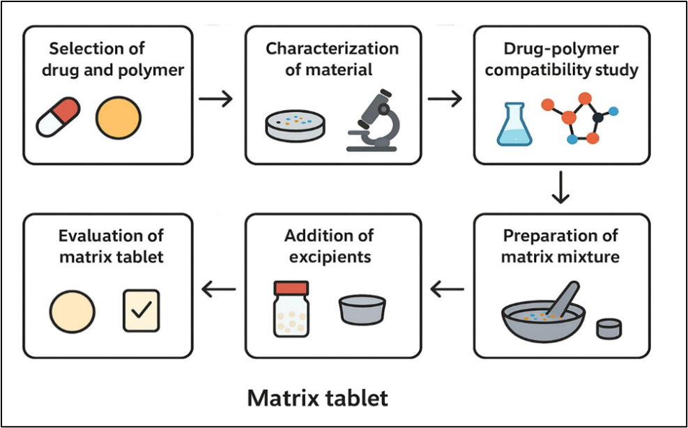Sustained Release (SR) matrix tablets are advanced oral drug-delivery systems designed to maintain a steady therapeutic concentration of drug over an extended period, thereby reducing dosing frequency and enhancing patient compliance. These systems are classified based on the type and role of the matrix-forming polymer into hydrophilic, hydrophobic, lipid-based, biodegradable, and mineral matrices. Matrix tablets are commonly prepared by direct compression, wet granulation, melt granulation, and hot-melt extrusion, depending on drug characteristics and polymer properties. The release of drug from a matrix system usually follows mechanisms such as diffusion, erosion, swelling, or a combination of diffusion–erosion, controlled by the physio-chemical nature of the drug and polymer. To ensure optimal functionality, the formulation undergoes systematic evaluation, including pre-compression tests (flow properties and compressibility), post-compression quality assessments (weight variation, hardness, thickness, friability, and drug content), and in vitro dissolution studies using suitable release media and mathematical kinetic modeling to determine the drug-release pattern. Overall, sustained-release matrix tablets provide a simple, cost-effective, and efficient approach to controlled drug delivery, making them highly suitable for drugs requiring prolonged therapeutic action.