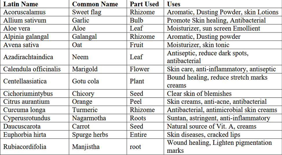 Herbs play a significant role, especially in modern pharmaceutical preparations, when the damaging effects of food processing and over medication have assumed alarming proportions. They are now being increasingly cosmetics, food and teas, as well as alternative medicines. The growing interest in herbs is a part of the movements towards change in life styles. This movement is based on the belief that the plants have a vast potential for their use as a curative medicine. The knowledge of medicinal plants used by the people of seems to be well known to its culture and tradition. In the present study we identified many plants used by the people to cure dermatological disorders and as cosmetics. Some of plants were found to have dual use, both as curative and cosmetic. Quality control test must be safe for longer period of time.
