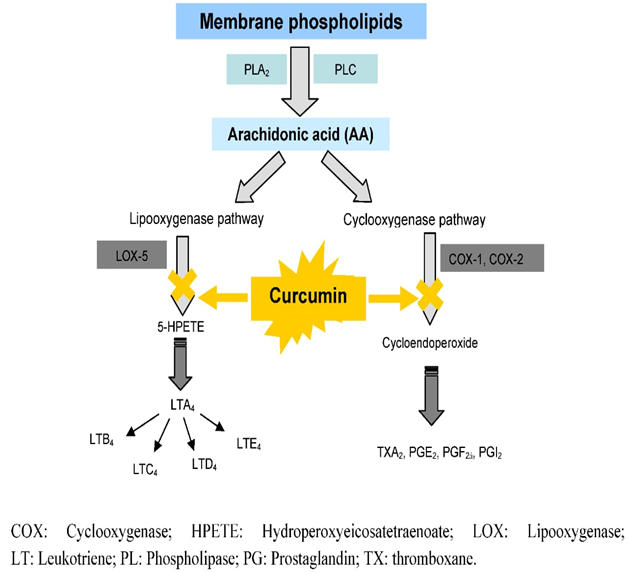 Flow chart showing Inhibitory Effect of cucurmin on Arachidonic Acid Pathway