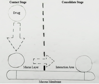 Stage 2: The consolidation stage is the second condition, where mucoadhesive molecules are activated by moisture, allowing them to relax and form bonds through weakened hydrogen and van der Waals interactions. There are two ideas that explain this phase: dehydration theory and diffusion theory. Diffusion theories implies mucoadhesive compounds and mucus glycoproteins engage by entangling their chains as well as forming supplementary bonds, creating a mixture that prolongs time of contact with the mucousal membrane. In contrast, theory of dehydration is less relevant for formulations that are solid or extremely hydrated.22