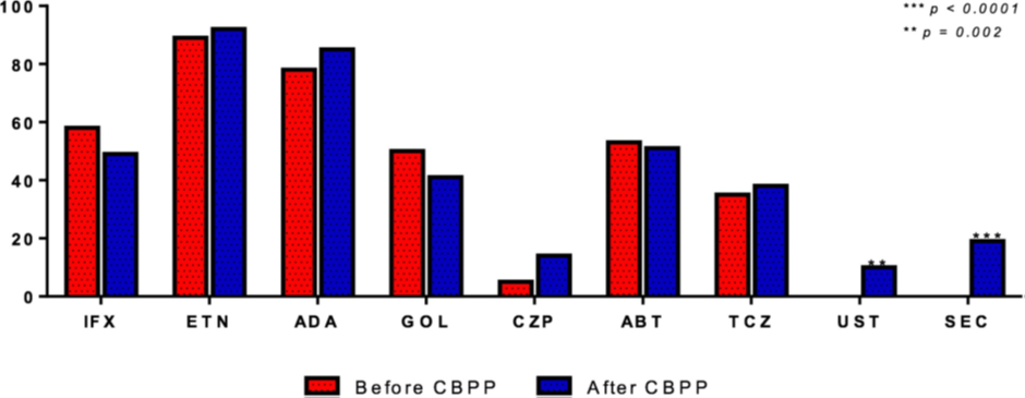 Fig 5. Prevalence of adverse events (AEs) before and after CBPP protocol implementation for individual bDMARDs.