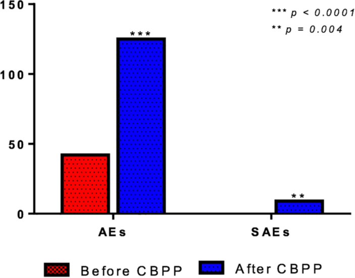 Fig 4. Prevalence of adverse events (AEs) and serious adverse events (SAEs) before and after CBPP protocol implementation.