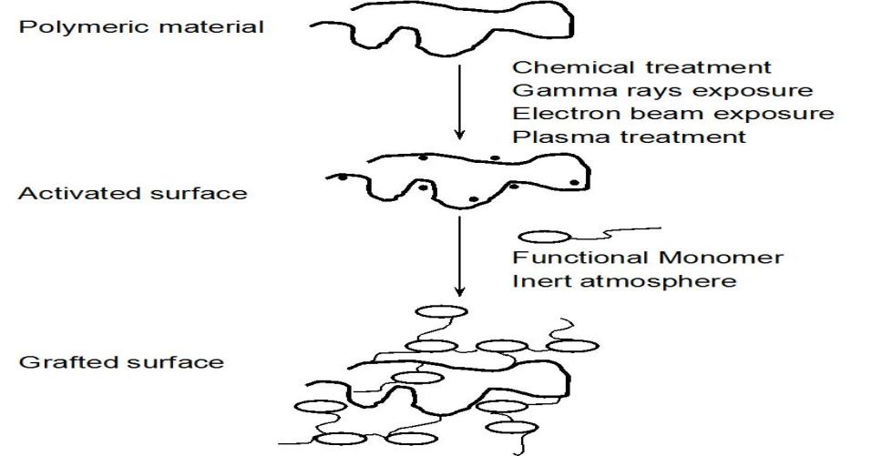 The suspension polymerization method is employed to form spherical hydrogel micro-particles measuring between 1 μm to 1 mm in size. The method of suspension distributes the monomer solution within a non-solvent to form a small droplet stabilized by a stabilizer. The polymerization initiated by the thermal decomposition of the free radical. For removal of unreacted monomers, cross-linking reagent, and initiator, the resulting micro-particle rinsed. 18 Grafting onto a support Grafting is polymerization of a monomer on the backbone of a preformed polymer. Chemical reagents or high-energy radiation therapy activate the polymer chains. On the activated macro radicals, growth of functional monomers results in branching, which subsequently results in crosslinking. 21
