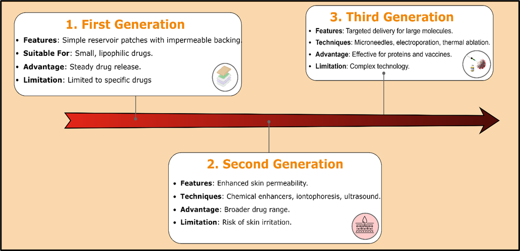 The first generation of transdermal delivery systems has laid the groundwork for the transdermal patches currently used in clinical practice. These patches are designed as reservoirs, encased with an impermeable backing on one side and an adhesive layer on the other, which contacts the skin.[23] The ideal candidates for first-generation systems are low-molecular-weight, lipophilic compounds that demonstrate efficacy at low doses.[24] Such candidates are preferred particularly when transdermal delivery offers advantages over oral routes, such as low bioavailability, less frequent dosing, and consistent delivery profiles. Despite the initial success and increasing public acceptance, the growth of this generation is anticipated to decline as the availability of suitable drugs diminishes (figure-2).