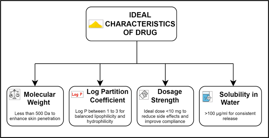 The drug used in transdermal systems is often selected for its ability to bypass first-pass metabolism and its compatibility with transdermal delivery requirements. Ideal properties include a molecular weight of less than 500 Da, an affinity for both hydrophobic and hydrophilic phases, a low melting point, and non-irritating, and non-allergic characteristics. The drug's log partition coefficient should be between 1 and 4, with a solubility greater than 1 mg/mL within a pH range of 5.0 to 9.0.[65]