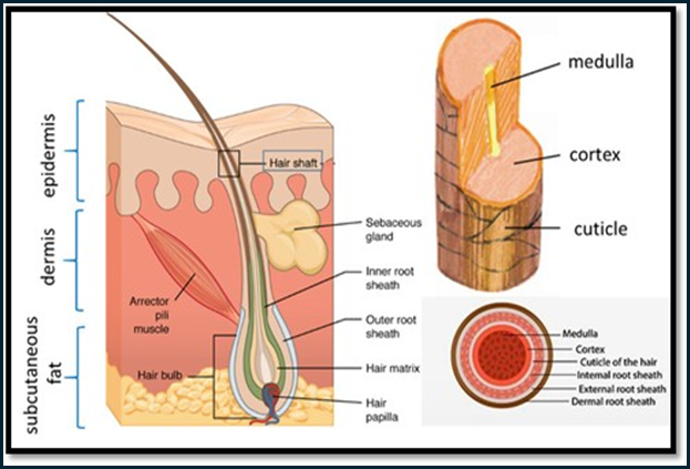 Hair is composed of two main parts: the hair follicle and the hair shaft. The hair follicle is located within the skin and is responsible for the growth and development of hair. The hair shaft is the visible portion that extends above the skin surface. It is considered biologically inactive (dead tissue) and mainly consists of proteins (keratin), small amounts of lipids, water, trace elements, and melanin, which gives hair its natural colour. Structurally, the hair shaft is divided into three distinct layers: the cuticle, cortex, and medulla. The cuticle is the outermost layer and is composed of overlapping scale-like cells. This layer serves as a protective barrier, shielding the inner structures of the hair from physical and chemical damage. It also plays an important role in maintaining the smoothness and shine of the hair shaft.