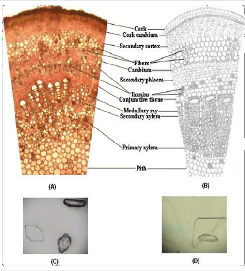 (A) T.S. Of The Young Stem Containing the Bark. (B) Schematic Diagram of The T.S. (C) Rhomboidal Crystals. (D) Prismatic Crystals