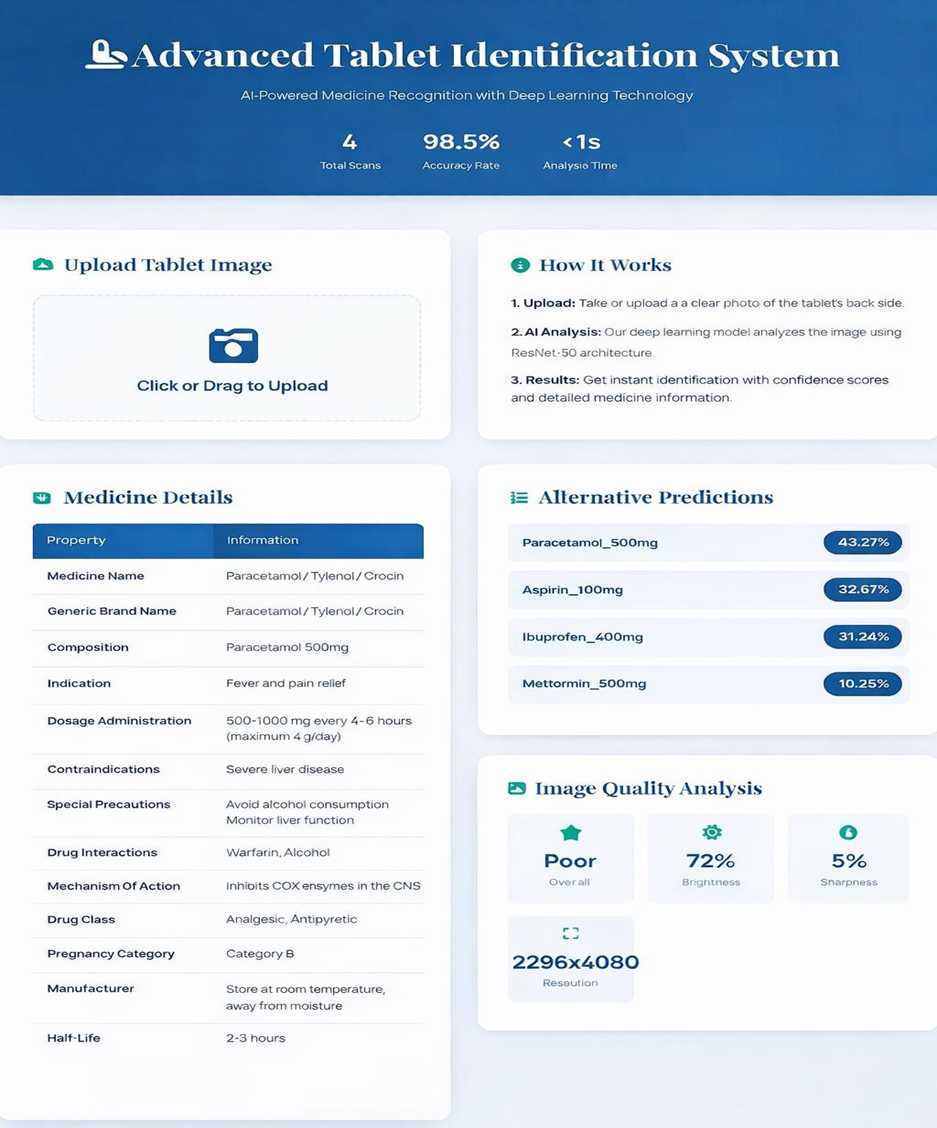 The Tablet Identification and Medicine Information System is an AI-based application developed to recognize pharmaceutical tablets using back-side image analysis and to retrieve detailed medicine information from a structured dataset. The system integrates computer vision, deep learning algorithms, and web technologies to create a complete workflow suitable for educational, research, and demonstration purposes.