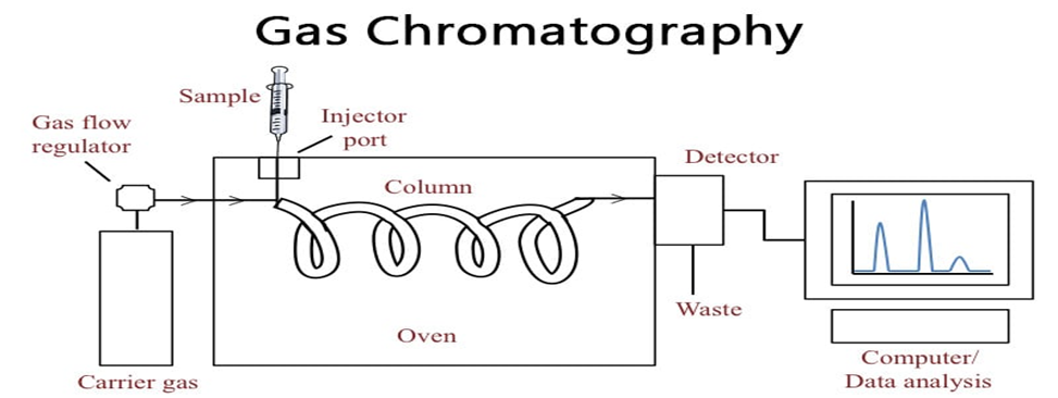 Gas Chromatography (GC) is one of the most widely utilized analytical techniques for the qualitative and quantitative analysis of volatile and semi-volatile compounds. Unlike liquid chromatography techniques, GC operates by using a gaseous mobile phase, typically an inert carrier gas such as helium, nitrogen, or hydrogen, to transport analytes through a stationary phase that is either coated onto the inner wall of a capillary column (in capillary GC) or packed into a steel or glass column (in packed GC) (McMaster, 2008). The technique is based on the principle that different compounds in a mixture will partition between the mobile and stationary phases at varying rates depending on their volatility and interactions with the stationary phase, thereby allowing for efficient separation. GC is particularly well-suited for substances that are volatile at elevated temperatures and thermally stable, making it ideal for the analysis of essential oils, organic solvents, hydrocarbons, pesticides, and residual solvents in pharmaceuticals. The process begins with the injection of a liquid or gaseous sample into a heated inlet port, where it is vaporized and swept into the column by the carrier gas. Inside the column, compounds are separated based on their boiling points and affinity for the stationary phase, which can be polar or non-polar depending on the analyte properties and desired selectivity. One of the major advantages of GC is its high resolution and reproducibility, enabling the accurate detection of trace components in complex mixtures. The method is especially valuable in pharmaceutical quality control for the detection of residual solvents, which must be quantified at very low levels in accordance with International Conference on Harmonisation (ICH) guidelines, particularly ICH Q3C, which governs acceptable limits for such impurities. Detection in GC is accomplished through highly sensitive and selective detectors, the most common of which are the Flame Ionization Detector (FID) and Mass Spectrometry (MS):