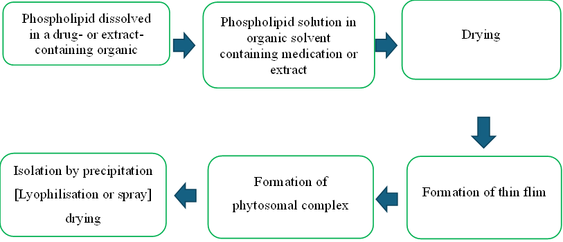 A phospholipid-containing combination was added to another solution containing phytoconstituents after both natural and synthetic phospholipids and phytoconstituents were melted using different solvents. The mixture was then stirred until a complex formed. Lyophilization is a method to separate the formed complex. The acyl group present in the phospholipids used in phytosome formation can be phosphoryl choline, phosphatidylserine, and phosphatidylethanolamine, which are created from stearic, oleic, palmitic, and linoleic acids. Phytosomes' active principle develops into a structural element (5).