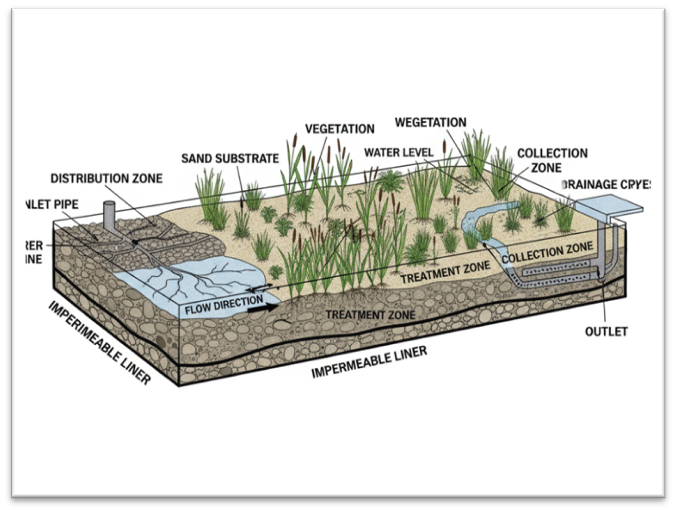 Wastewater flows into a shallow, sealed pool. This pool holds layers of gravel, sand, and soil. Wetland plants are grown here. They help microbes clean the water. Water spreads evenly at a controlled pace. It moves through the system. Filtering, plant absorption, and microbial action remove waste. Plants are trimmed. Sludge is removed. Water is then collected and tested. This confirms pollutants are reduced.(42)
