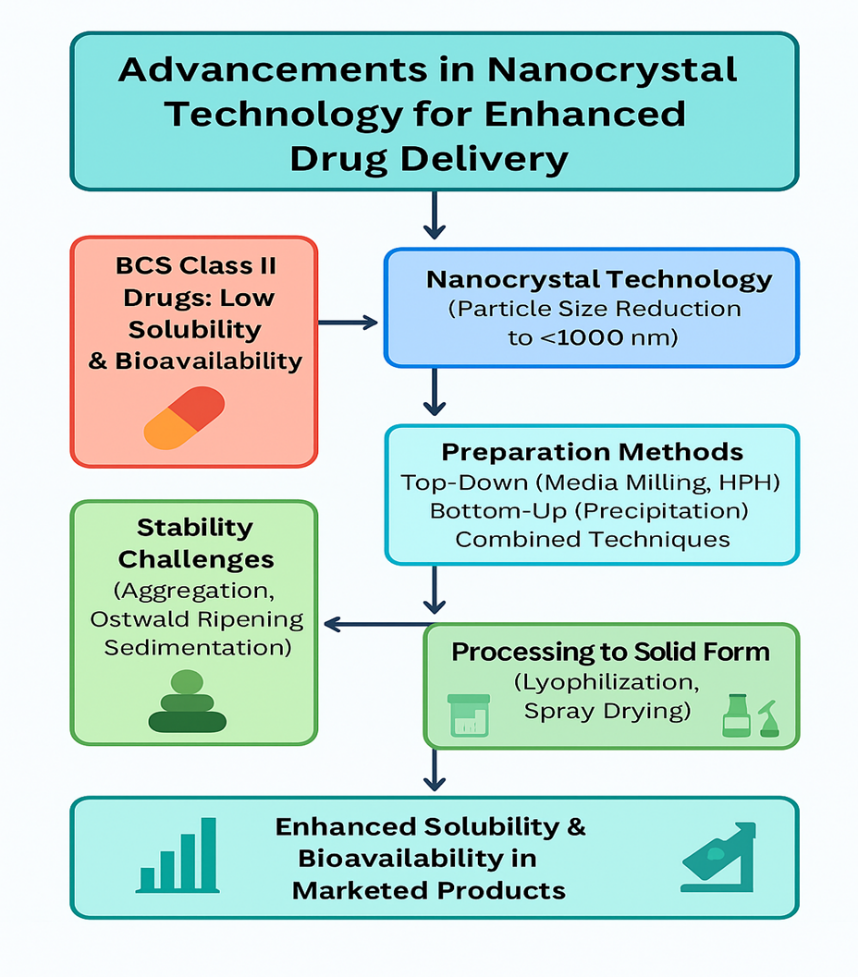 This flowchart summarizes the role of nanocrystal technology in enhancing the solubility and bioavailability of BCS Class II drugs, highlighting particle size reduction methods (top-down, bottom-up), stabilization challenges, solid form processing, and ultimate impact on marketed formulations.