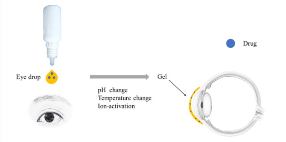 In the early 1980s, researchers discovered the novel idea of in situ gel. The primary purpose of in situ gel medication delivery to the ocular system is to increase viscosity in order to reduce drug drainage from the cornea. When applied, the pourable gels are liquid, but when they approach the eye's cul-de-sac, they go through a phase change and become visco-elastic gels that cause a reaction. to alter the environment, which will immediately increase the drug's bioavailability. The main drawbacks of in situ gels Are they impacted by ions, pH, or temperature? Compared to traditional eye drops, Bazzaz et al. (2018) found that in situ gelling systems offer a more effective and prolonged medication action [60].