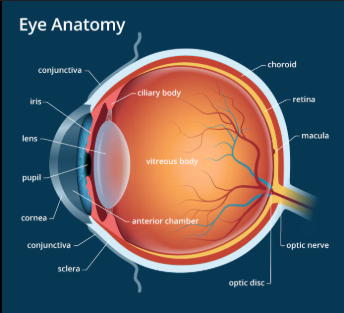 The eyeball: Also known as the globe, the eyeball is the primary component of the eye. Each sphere-shaped eye has a diameter of roughly 2.5 cm (1inch) [6]. There are many blood arteries in the eyeball. The eyeball's inside is packed with mostly with vitreous humour, a transparent, jelly-like fluid. The posterior (rear) region of the eye is filled with vitreous fluid. It aids in maintaining the eye's shape and supporting the inside tissues. An exterior, middle, and inner layer (from the outside to the inside of the eye) make up the structure of the eyeball, which is collectively referred to as the wall of the eye