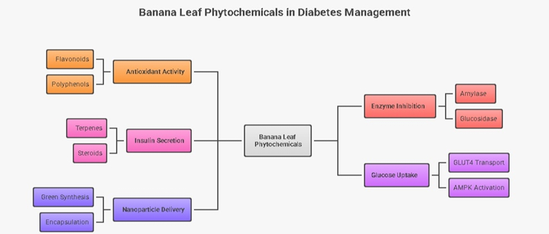Diabetes mellitus, which is often considered a multifunctional metabolic disorder that is mainly characterised by chronic hyperglycaemia, has become one of the most common global health issues of the 21st century. Despite there is already the availability of synthetic hypoglycaemic agents and various insulin therapies, they have resulted in adverse effects, high cost and limited accessibility in the developing regions. This has led to an extensive use of plant-based therapy for the control of insulin levels. Among these various plants, the genus Musa or commonly referred to as the banana a plant that is extensively used for its medicinal values but also for its therapeutic versatility. Traditionally, various parts of the plant have been used for the treatment and management of the metabolic disorder commonly diabetes. This review mainly provides a comprehensive exploration of the banana leaf and its chemical components in the prevention and treatment of diabetes mellitus. Also, the mechanistic insights underlying the antidiabetic potential of banana, mainly the enhancement of insulin sensitivity, regulation of lipid metabolism, and modulation of glucose transport, have been reviewed. Furthermore, the role of antioxidants and polyphenols present in the banana leaf, which is a key component in restoring the pancreatic ?-cell integrity and maintaining glucose homeostasis. However, despite such promising data, human clinical trials and investigations remain sparse, and the optimisation, toxicity studies, and dosage potentials are still lacking. This review concludes by identifying the critical research gaps for future perspectives that mainly help bridge the gaps of traditional knowledge with pharmacology, urging the development of a banana leaf-derived nutraceutical and formulation as an affordable, eco-friendly and sustainable alternative for diabetic management.