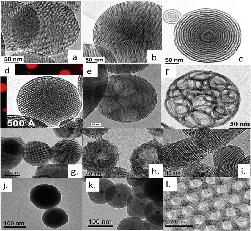 Fig. 2. TEM images of MSNs prepared by EISA (a.-d.) and solution-based methods (e.-l.). Reprinted with permission from [28]. Copyright (2013) American Chemical Society.