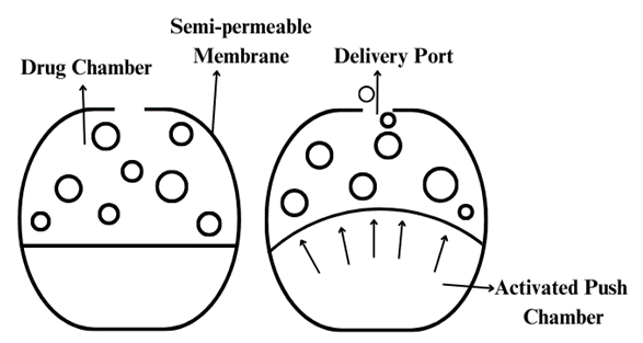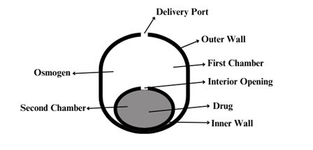 In 1955, the first osmotic pump was reported by two Australian Physiologist. They were working on the drug delivery to the gut of sheep and cattle. The pump was consists of three compartment one contained drug molecule with orifice, second had salt with elastic diaphragm which contains excess solid salt and third had water chamber (Fig.1). The semipermeable membrane were separates the dug and water compartments. The difference which was created by osmotic pressure, shifts the water to salt chamber. The volume of salt compartment gets increased due to this water flow, which further expands of latex diaphragm, results expulsion of drug from device.